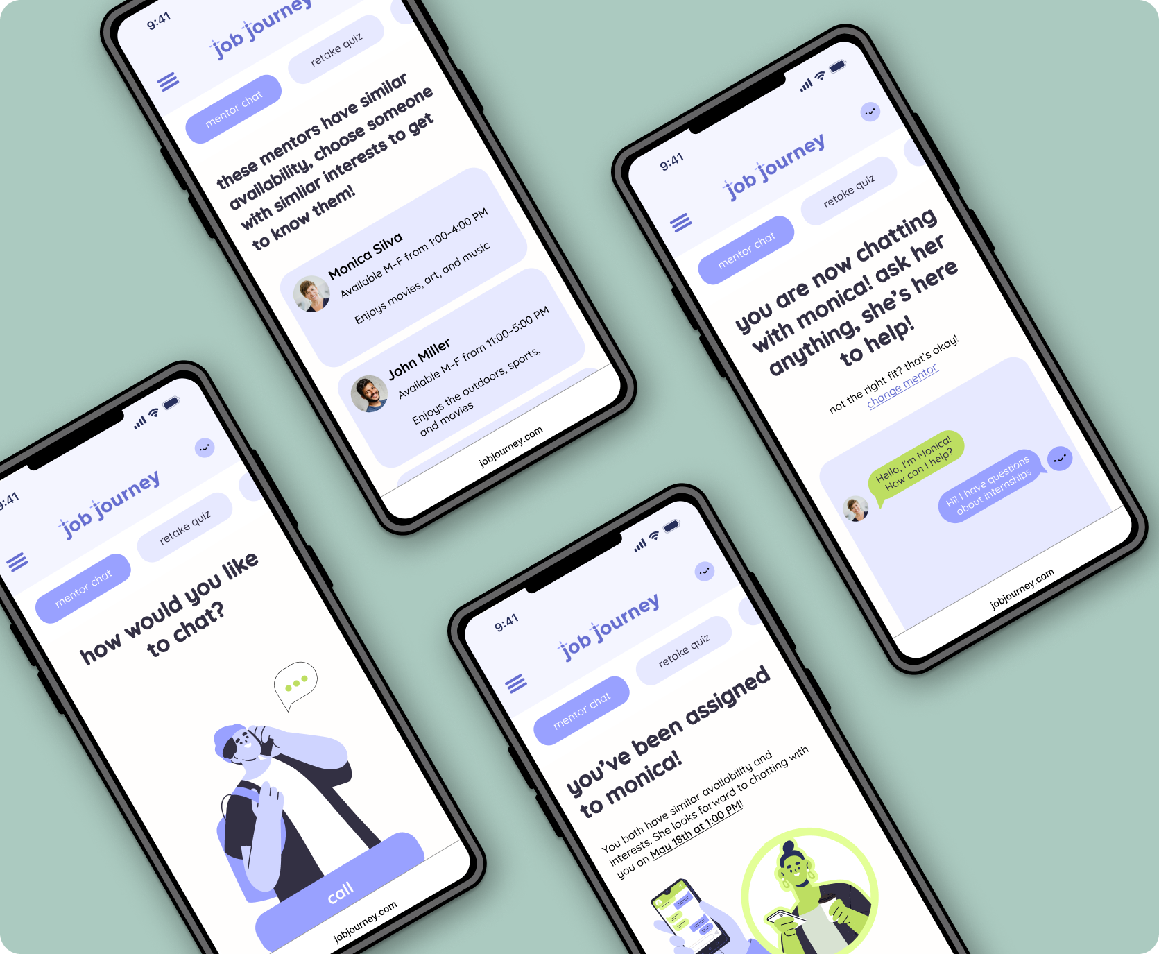 Job Journey is a concept pop-up event designed to provide foster youth with essential resources to help them secure employment. My group and I created both a website and a mobile site where participants can learn about the event and schedule appointments. Job Journey offers interview practice, free clothing, and more. Through our website, youths can also take a career quiz to find jobs suited to their skills and interests, and apply for those positions directly.